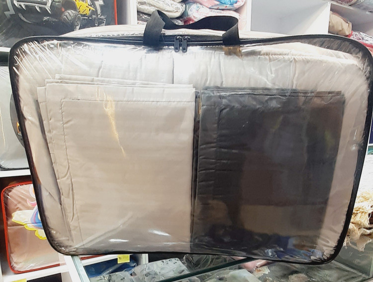 یک عدد لحاف (یک طرف رنگ طوسی کم رنگ ، یک طرف طوسی پر رنگ) ، دو عدد روبالشتی از رنگ طوسی پر رنگ ، دو عدد رو بالشتی از رنگ طوسی کم رنگ ، یک عدد کاور تشک کشدار